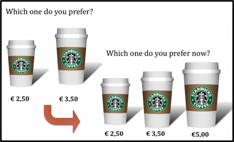 Doordat de rechterbeker van €5 is toegevoegd, lijkt de middelste optie ineens aantrekkelijker.